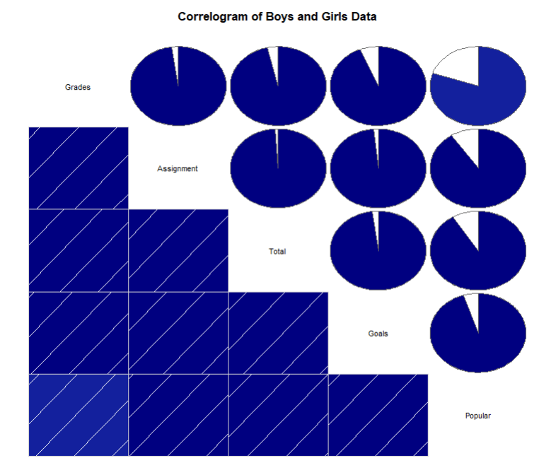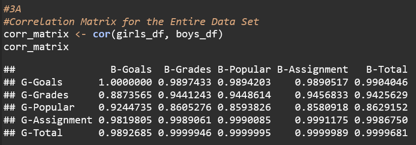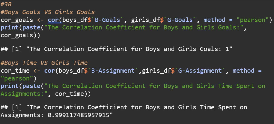 B. Pearson correlation coefficient for x= girls and y =boys. (goals, time spend on assignment)