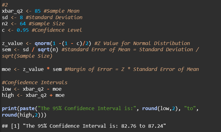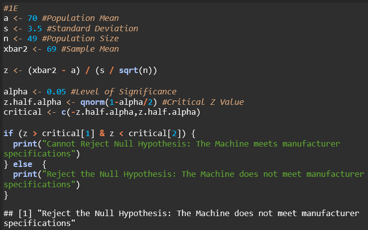 This code shows that the null hypothesis cannot be rejected because the calculated z-score falls within the range of the critical z-values, indicating that there is not enough evidence to suggest that the machine’s mean cookie strength significantly differs from the manufacturer’s specified mean.