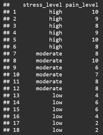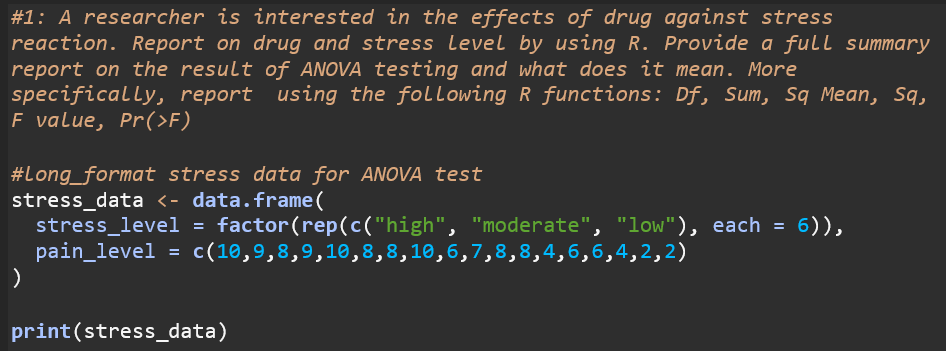Pr(>F) : Probability of observing an F value as extreme as the one calculated if there were no true differences between stress levels P value is 0.00000408 which is significant less than the typical significance level of 0.05 Low P value provides strong evidence to reject the Null Hypothesis (That there is no variability between stress levels)
