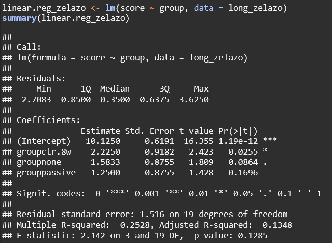 groupctr.8w = The average score of the ctr.8w group is 2.225 points higher than the base group. The p value (0.0255) indicates that this is significant at the 0.05 level