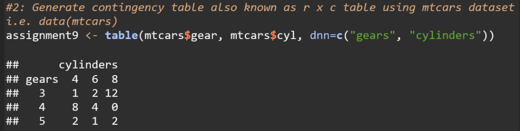 This code creates a contingency table that displays the frequency distribution of the number of cars with different combinations of gears and cylinders in the mtcars dataset.