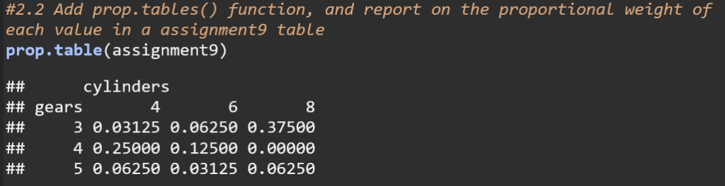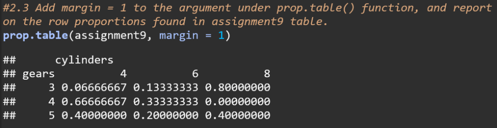The code uses the argument margin = 1 to calculate row proportions for the assignment9 table. This means that each row’s values are shown as proportions of the total for that row. For instance, in the row for 3 gears, 66.67% of the cars have 4 cylinders, 13.33% have 6 cylinders, and 80% have 8 cylinders. This approach normalizes each row, making the sum of proportions in each row equal to 1.
