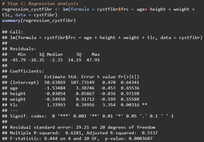 Residual Standard Error: the average value of frc falls 29.21 values away from the regression line Multiple R Squared: 62.81% of the variation of frc can be explained by these predictors Adjusted R Squared: 0.5537, which accounts for the number of predictors in the model F-statistic: 8.444 on 4 and 20 degrees of freedom, with a p-value of 0.0003687, indicating that the model as a whole is statistically significant at the highest level (0.001)