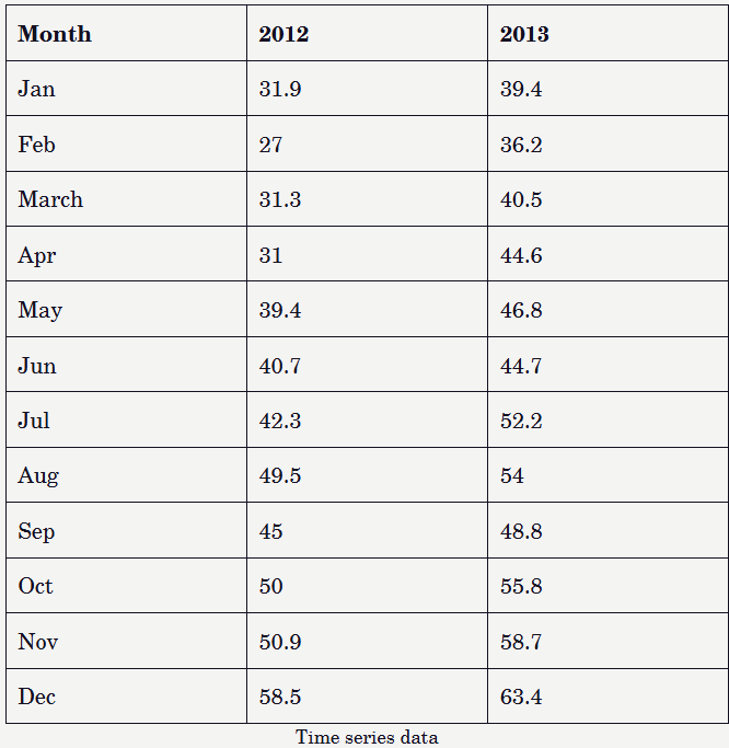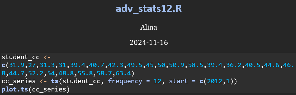 This code imports the data, transforms it into a time-series object, and generates a plot to visualize the changes in values over a 24-month period, spanning from January 2012 to December 2013.