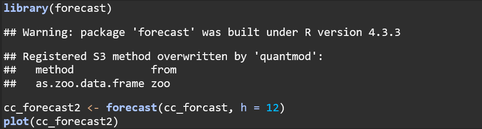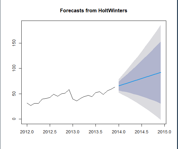 This plot displays the results of forecasting using the Holt-Winters model for the next 12 time periods. The black line represents the historical observed data, while the blue line and shaded areas represent the forecast and confidence intervals, with 80% prediction intervals shown in the dark blue section, and 95% prediction intervals shown in the light grey.