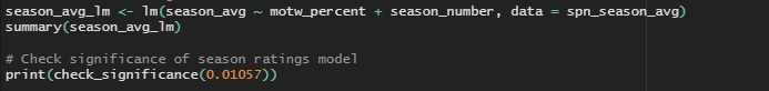 To answer that final question, I first needed to calculate the average rating per season and the percentage of MotW episodes in each season. Then, I built a linear model to assess if the percentage of MotW episodes and season number affected the overall season rating
