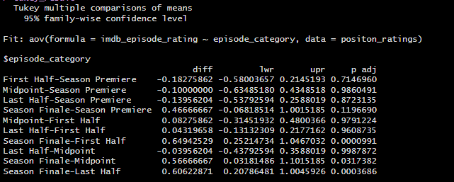 Because this model was found to be significant, I wanted to know which episode_position category performed the best of the five different options, so I decided to run a Tukey’s HSD test.