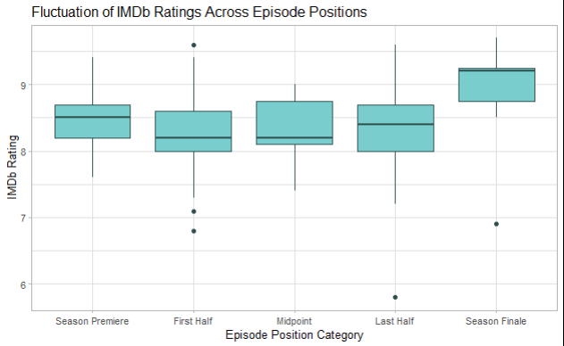 Insights to be gained: Determine whether the timing of an episode within a season (e.g., premiere, midpoint, last half, or finale) affects audience reception of it. Understanding this relationship can help show creators and producers in planning the structure of a season and help determine how to best utilize production budgets (such as spending less poorly received episode positions or more on season premires or finales)
