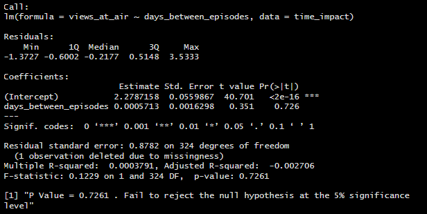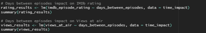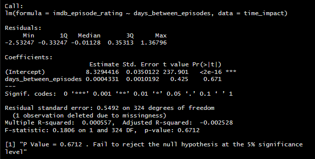 In this situation, I had the option to either run an ANOVA to test if the categorical factors categories have a significant impact on my response variable or build a linear regression model to test if the numeric days between episodes have a significant impact on the response variables. I chose to do a Linear Regression analysis because utilizing my numeric days variable over my grouped categorical factor would give me more precise answer to my question rather than an ANOVA group analysis. Plus, If this model proved significant, I would be able to see the impact of each additional day between episodes on IMDb rating, rather than giving show creators and producers a window of time.