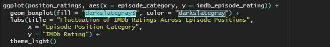 To begin this analysis, I needed to aggregate my dataset to recategorize the episode_position variable as a categorical factor, as not all seasons of the show were the same length. For this analysis, I wanted to look at the type of episode each position represented, rather than the literal numeric episode_position.