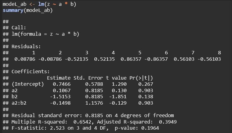Model z ~ a : b: This model only includes the interaction between a and b without main effects, which led to a singularity (NA for a2:b2). It’s less robust and restricts interpretation, making it harder to assess the individual contributions of a and b.
