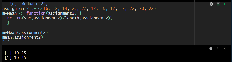 Then, the function takes the sum of the vector (adding up each value) and divides it by the length of the vector (how many elements are in the vector). Double checking our custom function against the base r function mean(), we can see that both of these functions are returning the same value.